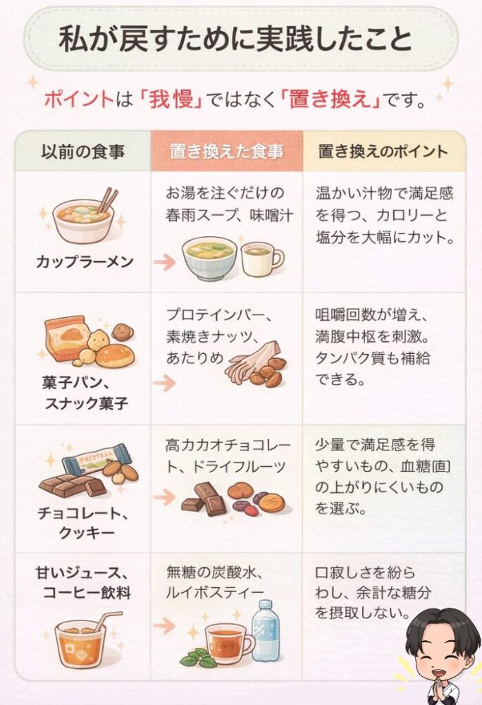 このままでは心も体も壊れてしまうと感じ、食生活の根本的な見直しを決意しました。ポイントは「我慢」ではなく「置き換え」です。