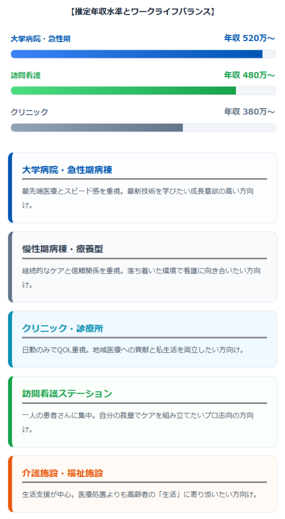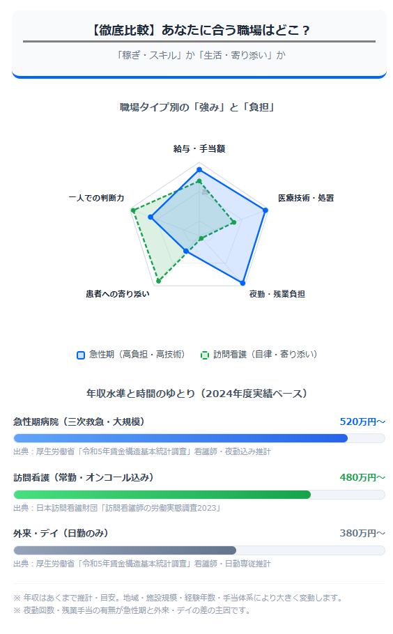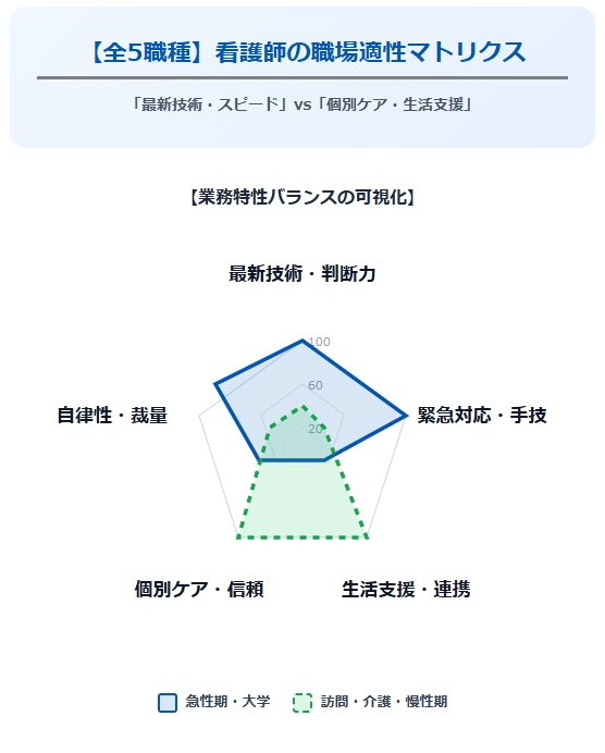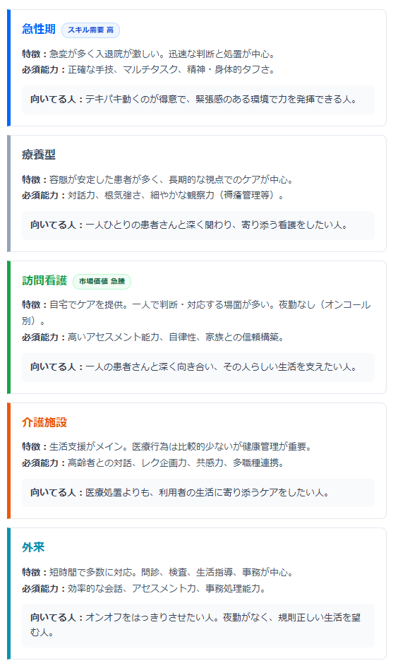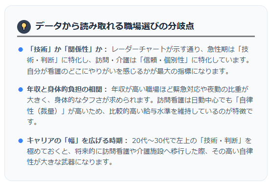 💬 Hさん(31歳、訪問看護師、経験8年) 「病棟で同じミスを繰り返し、『仕事ができない』と自分を責める日々が続きました。感情コントロールも苦手で周囲に迷惑をかけていた気がします。転職して訪問看護にシフトしたら、1対1のケアで自分のペースを保て、患者さんの些細な変化にしっかり向き合えるようになりました。ただ、まだ完璧とは言えず、時々迷うことはありますが、以前より能力を発揮できている手応えを感じています」 → 出典:マイナビ看護師 2026年1月投稿 + 筆者知人ヒアリング