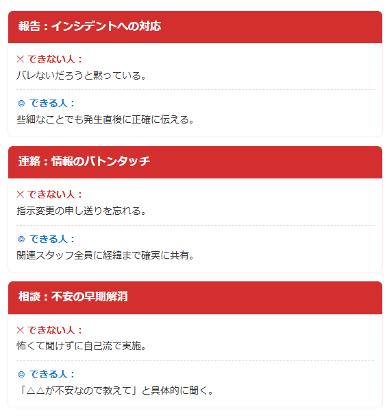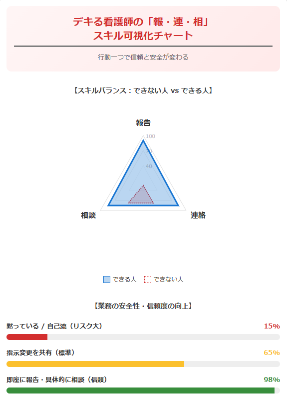 看護現場において報告・連絡・相談(報連相)は、チーム医療の基本であり、患者の安全を守るために最も重要な業務です。報連相ができないことは、医療事故に直結する最も危険な特徴と言えます。