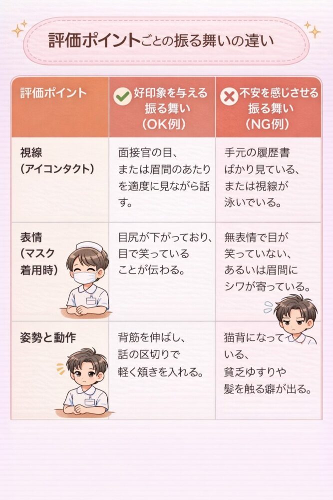 昨今の医療現場ではマスク着用での面接も珍しくありません。顔の半分が隠れている状態では、目元の表情と声のトーンだけが感情を伝える手段となります。