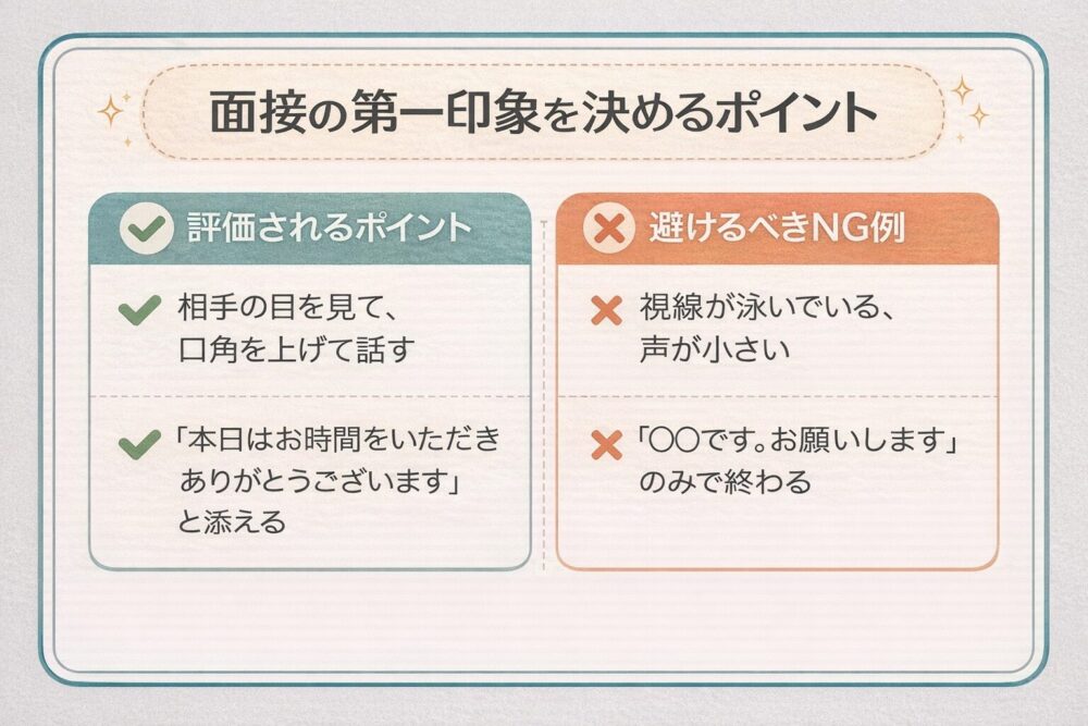 | ゴールのイメージ | 会話のきっかけを作り、好印象を与える | 「採用したい」と思わせる決定打を打つ |