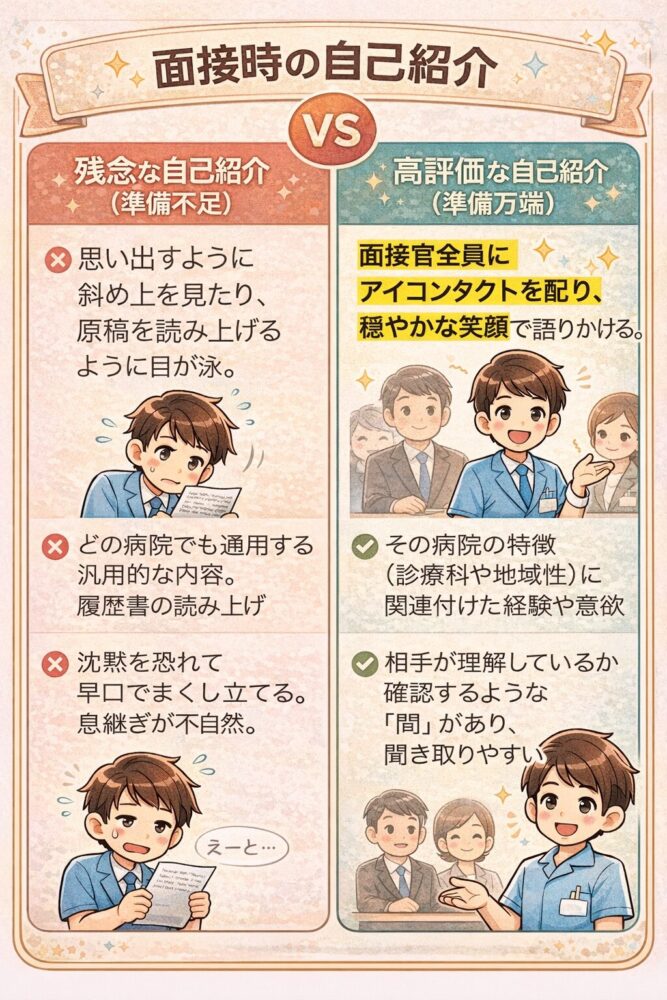 以下に、準備不足な自己紹介と、準備が行き届いた高評価な自己紹介の違いを整理しました。