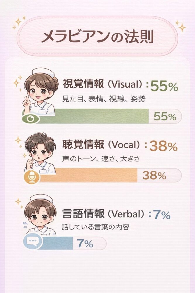 自己紹介の30秒間において、話す内容と同じくらい、あるいはそれ以上に重要なのが「非言語情報」です。ここで意識すべきなのが、有名な「メラビアンの法則」です。