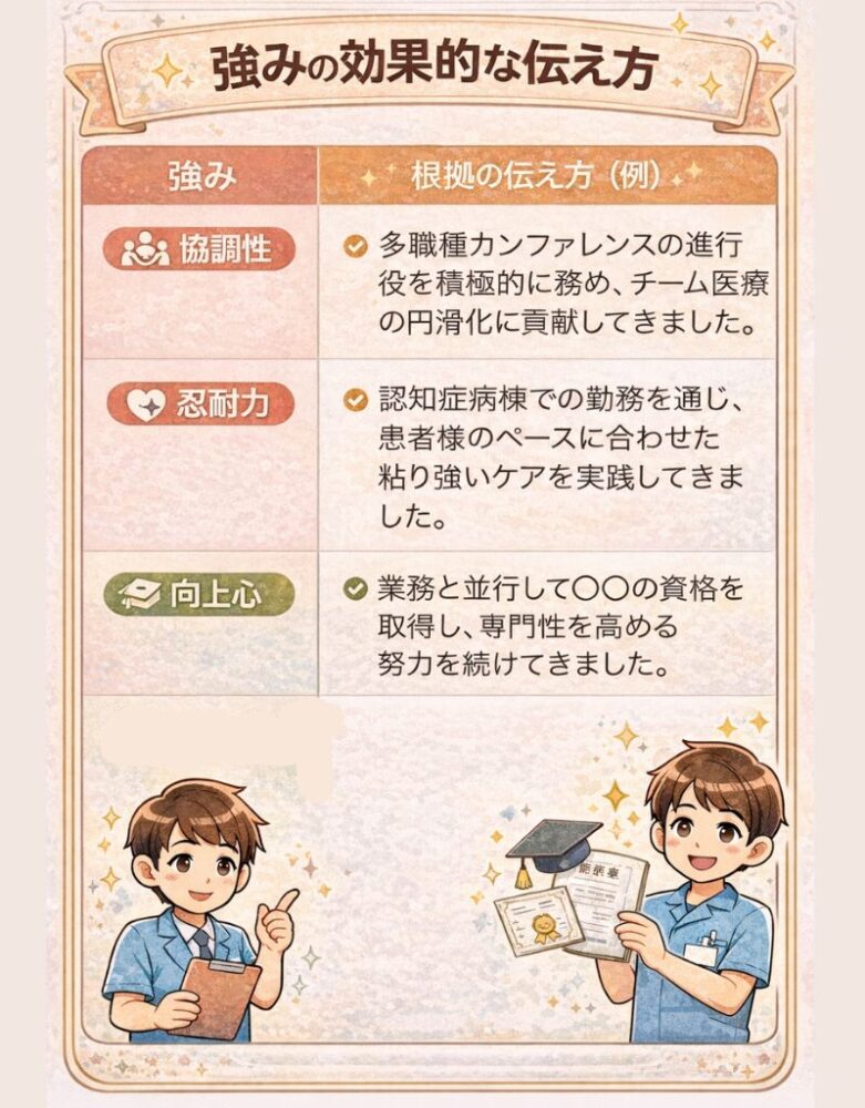 この「強み」は、応募先の病院や施設が求めている人物像とリンクしていることが重要です。例えば、急性期病院であれば「テキパキとした対応力」や「体力」、訪問看護であれば「利用者様に寄り添う傾聴力」などが好まれます。