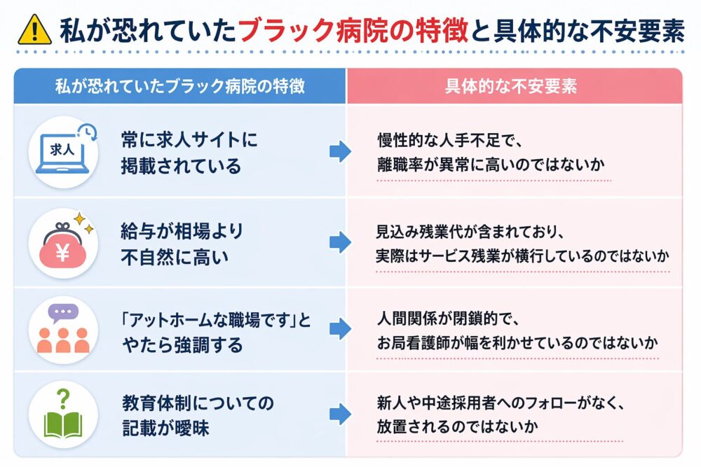 当時、私が特に恐れていた「紹介されそうなブラック病院の特徴」は以下の通りです。