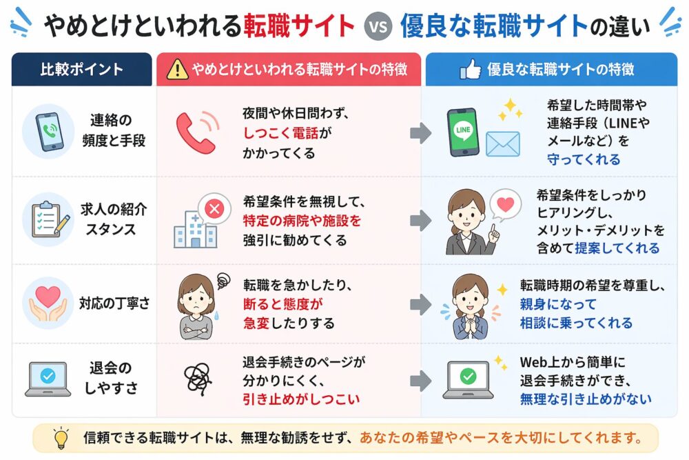 A:インターネット上の口コミや評判で「やめとけ」と言われがちな看護師転職サイトには、いくつかの共通する特徴があります。