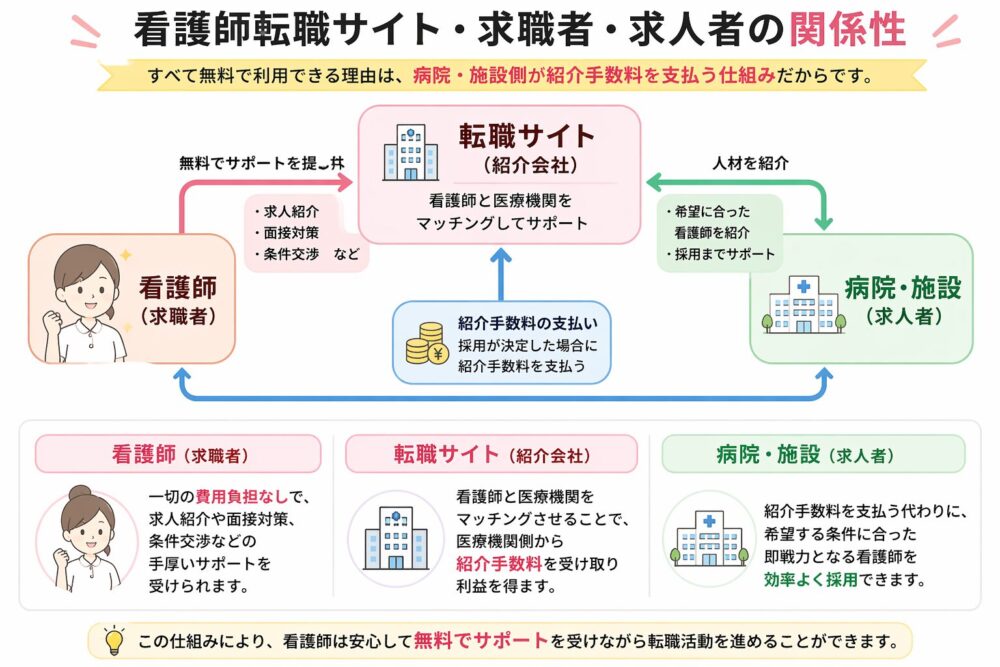 「タダより高いものはない」と怪しんでいましたが、看護師転職サイトが無料で利用できるのは、採用が決まった際に医療機関から支払われる「紹介手数料」で運営されているからでした。