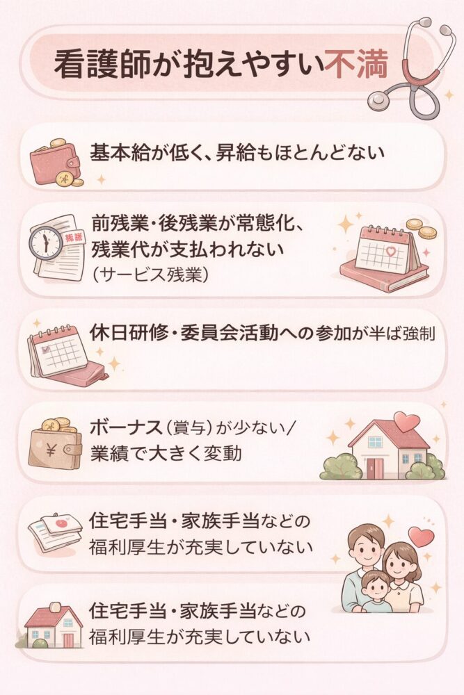 ここでは、多くの看護師が転職を決意する代表的な理由を、私自身の体験談や採用担当者としての視点も交えながら詳しく解説します。