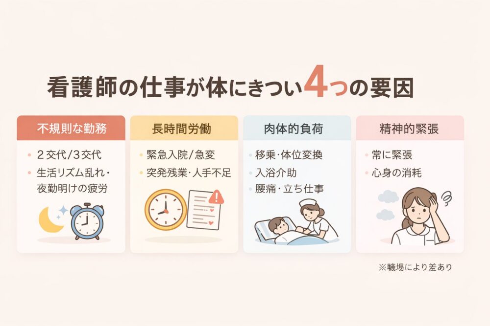 人の命を預かる看護師の仕事は、精神的な緊張感に加え、身体的な負担も非常に大きいのが現実です。特に、不規則な勤務形態は多くの看護師を悩ませています。