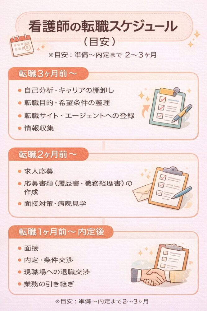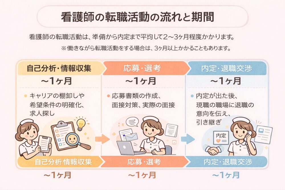 看護師の転職活動にかかる期間は、準備から内定まで平均して2〜3ヶ月程度です。 もちろん、個人の状況や転職先の状況によって変動します。働きながら転職活動をする場合は、時間に制約があるため、3ヶ月以上かかることも珍しくありません。