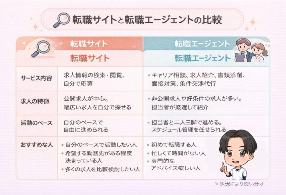 転職サイトは自分で求人を探して応募するのに対し、転職エージェントは担当者が求人紹介から面接対策、条件交渉まで一貫してサポートしてくれます。