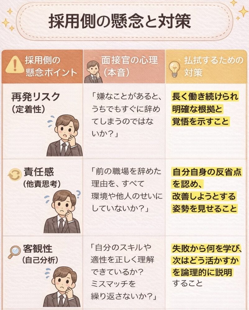 採用側は「採用コストをかけたのにすぐ辞められた」という事実を重く受け止めるため、「またすぐに辞めるのではないか」という懸念を抱きます。ただし、退職理由が明確であり、それが「誰が聞いても辞めて当然だ」と思えるような状況であれば、情状酌量の余地があります。