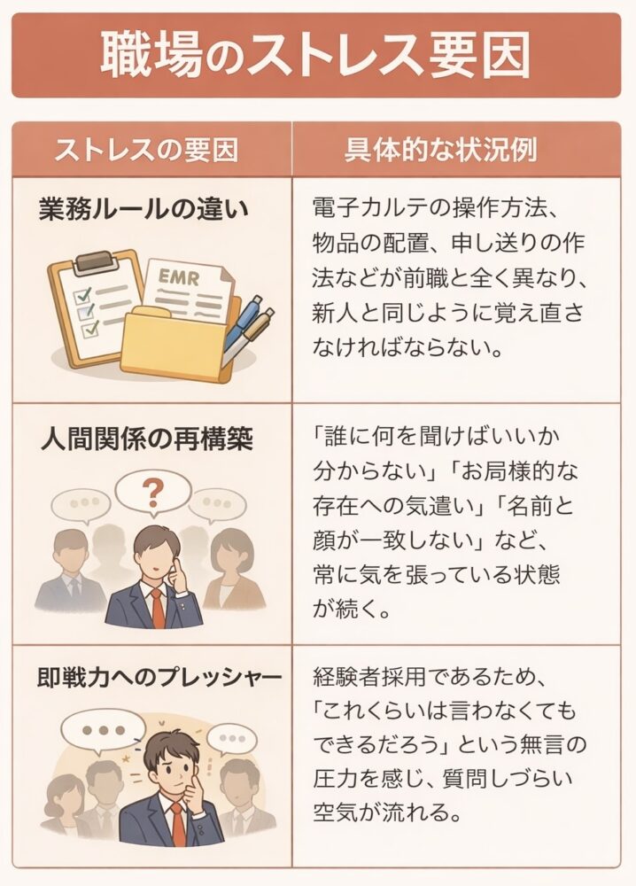 特に転職直後の看護師が抱えやすいストレス要因を整理すると、以下のようになります。
