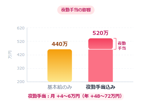 2交代制の夜勤1回で約11,000〜11,800円。三交代制でも準夜勤・深夜勤で4,000〜5,700円程度。月4〜5回の夜勤で4〜6万円上乗せされ、「手当だけでボロ儲け」と勘違いされやすいです。