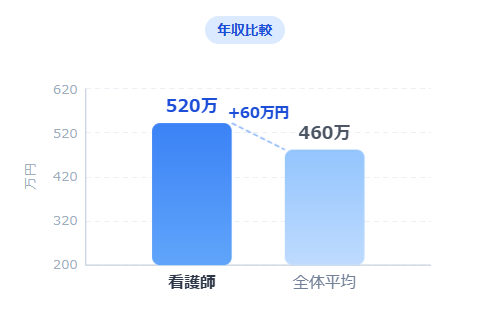 令和6年データで看護師平均年収519.7万円に対し、全給与所得者平均は約460万円前後。約60万円近く上回っています。